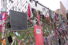 Oklahoma City National Memorial west side fence: A plaque explains items left by family and friends of their loved ones lost during the explosion. This site has been turned over to the National Park service who maintains the grounds, including the display of momentos left by people paying tribute in their own way. |